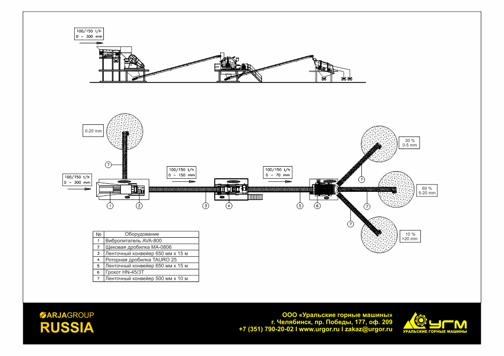 Первичное дробление осуществляет щековая дробилка MA-0806 (или аналог) (производительность до 150 т/час), сырье на которую попадает через вибрационный питатель AVA-800. После первичного дробления щебень передается в роторную дробилку Tauro 25 (производительность – 150 т/час). Кубовидный щебень, произведенный роторной дробилкой, сортируется грохотом HN-45/3T на три товарные фракции (0-5 мм, 5-20 мм и свыше 20 мм).